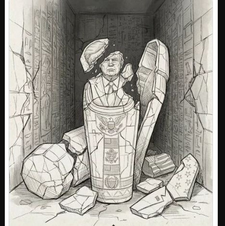 Imazhi e përshkruan udhëheqësin amerikan si një sarkofag guri në stilin e lashtë egjiptian brenda një varri të zbukuruar me hieroglife. Flamuri amerikan dhe Vula e Madhe e Shteteve të Bashkuara janë vizatuar si gdhendje në arkivol, i cili po çahet dhe po shkërmoqet. Teksti shoqërues në karikaturë thotë: “Si Faraoni”.