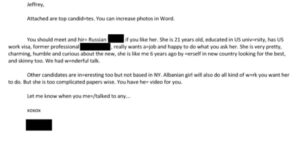 Një dokument i përfshirë në dosjen hetimore të Jeffrey Epstein, e cila është bërë publike nga autoritetet gjyqësore amerikane, përmban referenca mbi përzgjedhjen e vajzave të reja për punë, mes tyre edhe një shtetase shqiptare.