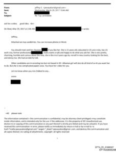 Në përmbajtjen e komunikimit përmenden disa “kandidatë kryesorë”, të cilët i prezantohen një personi tjetër për vlerësim. Mes tyre përshkruhet një vajzë ruse 21-vjeçare, për të cilën theksohen jo vetëm të dhënat mbi arsimin dhe statusin e vizës së punës në Shtetet e Bashkuara, por edhe elementë që lidhen me pamjen fizike dhe gatishmërinë për të përmbushur çdo kërkesë.