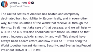 Vetëm disa orë pasi tha se shpreson që Mbretëria e Bashkuar, Kina dhe vende të tjera do të dërgojnë anije luftarake, presidenti amerikan tha se vendet “që marrin naftë përmes Ngushticës së Hormuzit duhet të kujdesen për atë kalim”.